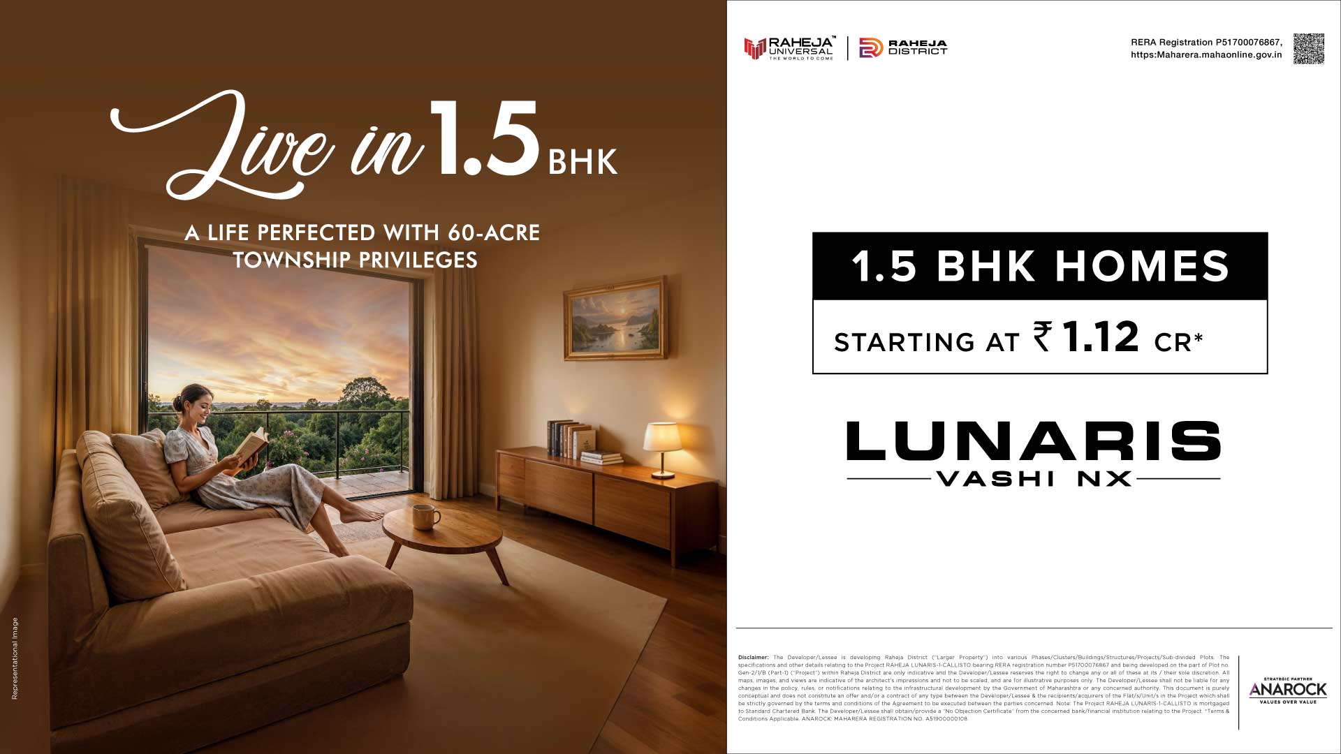 The Developer/Lessee is developing the Raheja District into various Phases/Clusters/Buildings/Structures/Projects/Sub Divided Plots. The specifications and other details of one of the Project being Raheja Lunaris-1- Callisto bearing RERA Registration P51700076867 (“Project”) shall be developed on the part of Plot no. Gen-2/1/B (Part-1) admeasuring about 7.912 acres (“said Property”) within the Raheja District, are only indicative and the Developer/Lessee reserves the right to change any or all of these at its / their sole discretion. All maps, images, and views are indicative of the architect’s impressions and not to be scaled and are for illustrative purposes only. The proposed infrastructure is presently proposed by the Government of Maharashtra and the Developer/Lessee shall not be liable for any change in the policy, rule, or notifications of the Government of Maharashtra as regards the same. This document is purely conceptual and does not constitute an offer and/or a contract of any type between the Developer/Lessee & the recipients and acquisition of the Flats/Units in the “Project” shall strictly be governed by the terms and conditions of the Agreement to be executed between the parties. Note: The “Project” is mortgaged to Standard Chartered bank. Raheja Universal (Pvt) Ltd. Shall obtain/provide a “No Objection Certificate”from Standard Chartered bank for the transfer of Flats/Unitsin the “Project”. *Terms & Conditions Applicable. ANAROCK: MAHARERA REGISTRATION NO. A51900000108